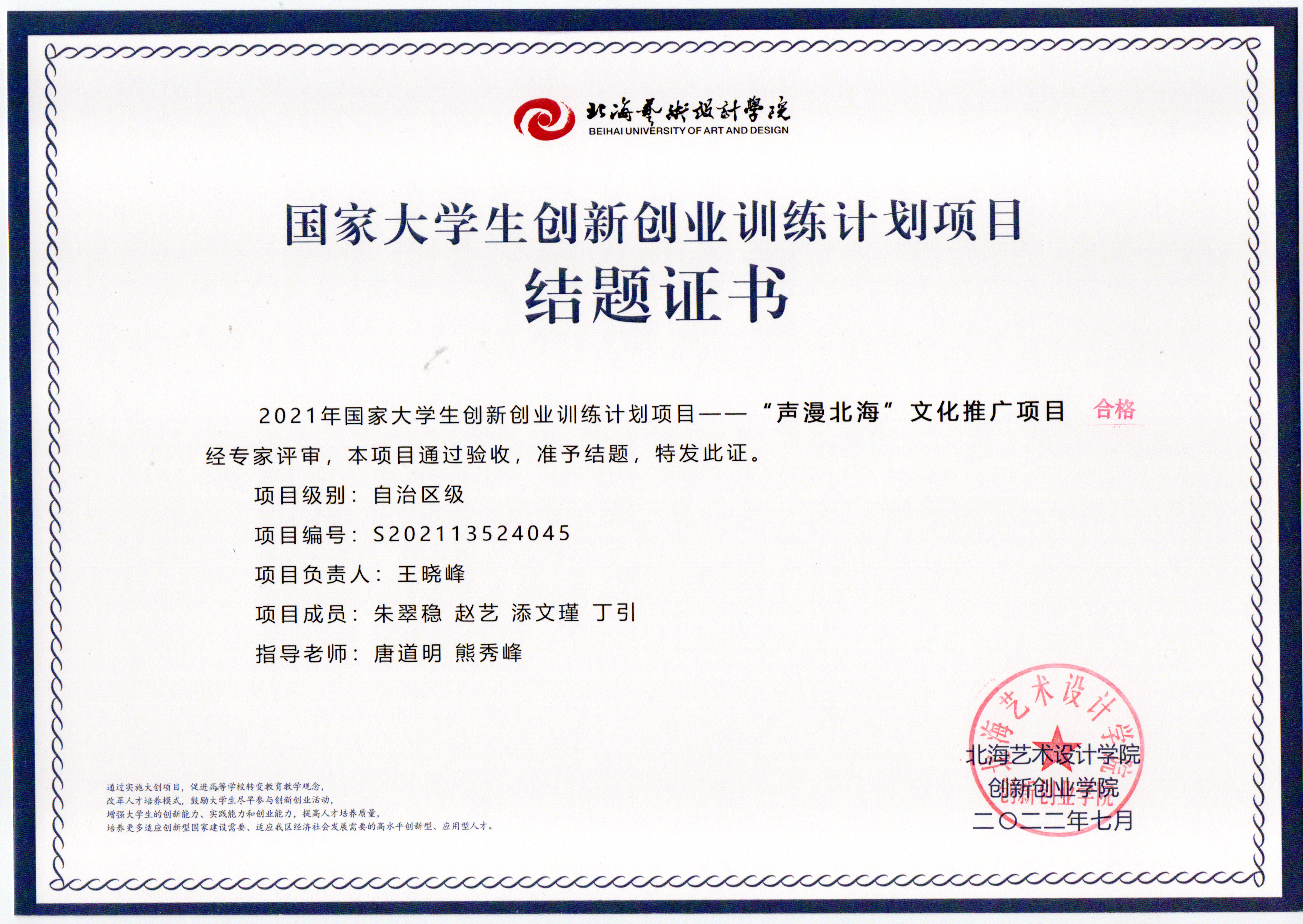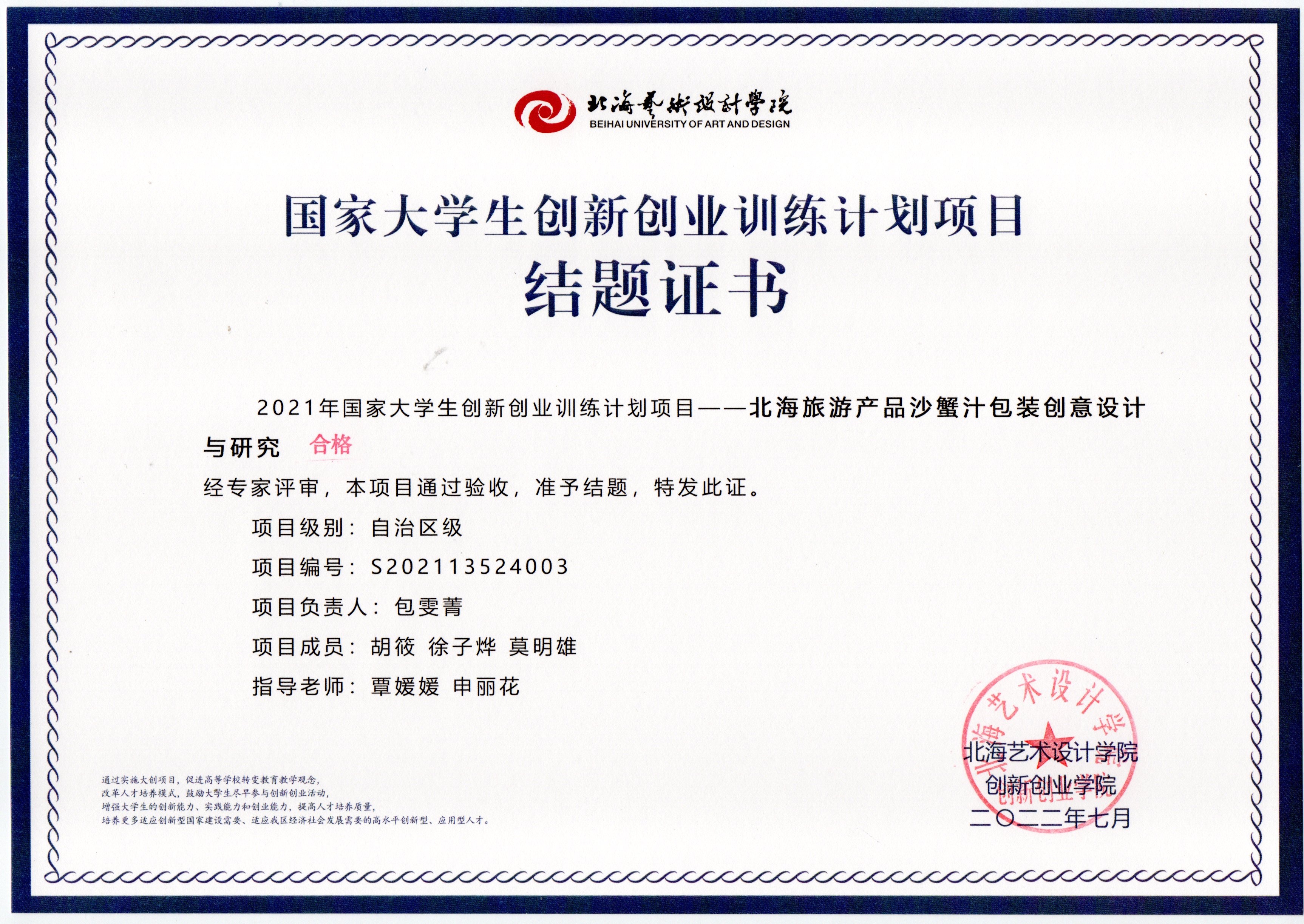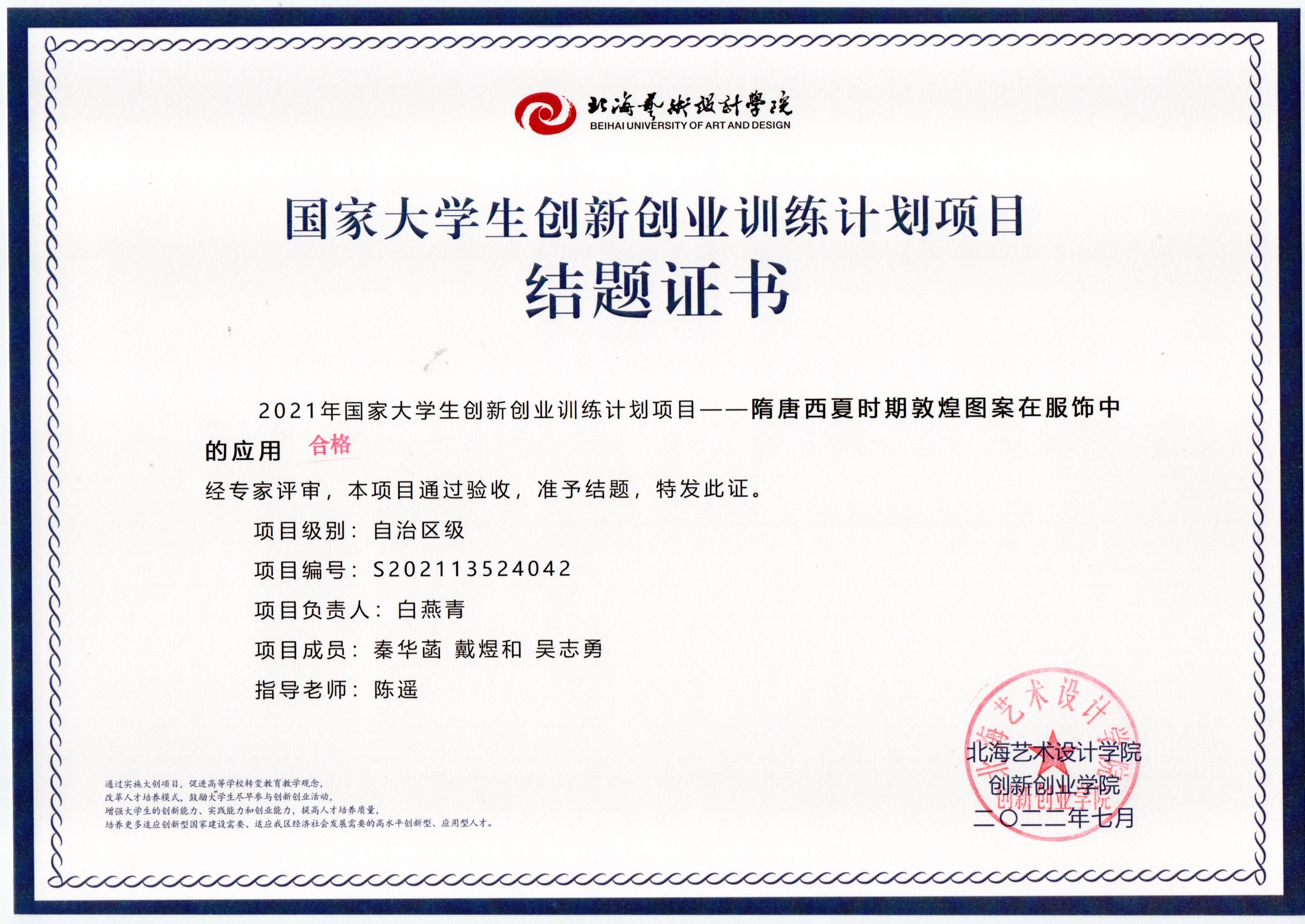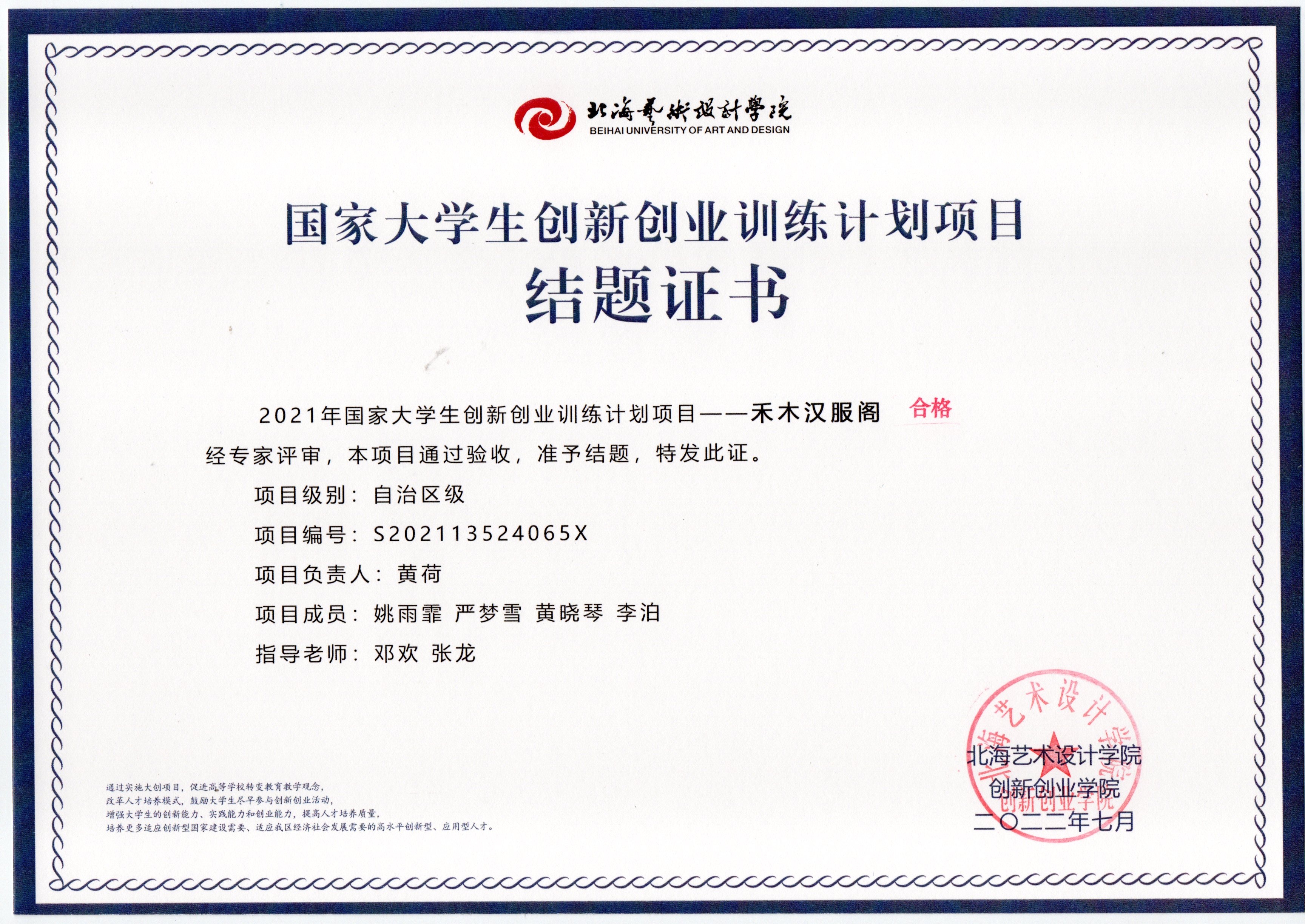 2022年大创项目结题证书(2021立项)