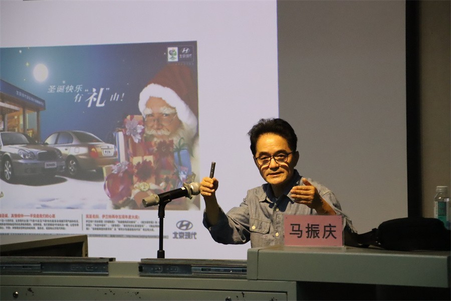 马振庆教授谈及有关色彩的文化内涵,他通过列举医院因颜色差异而造成人的心理差异、东西方对红色和黄色的不同态度两个鲜明的例子,让学生了解不同色彩的文化内涵,从而加深掌握颜色的文化寓意和象征。他还通过塞尚、高更、梵高的作品指出艺术设计是由复杂到简单的过程。在介绍中国风景画时,他建议同学们学习张钦若先生的意象画所表达的主观性特征和吴冠中先生对艺术的执着与探索的精神,在大量的艺术品鉴中养成自我艺术审美和品格。