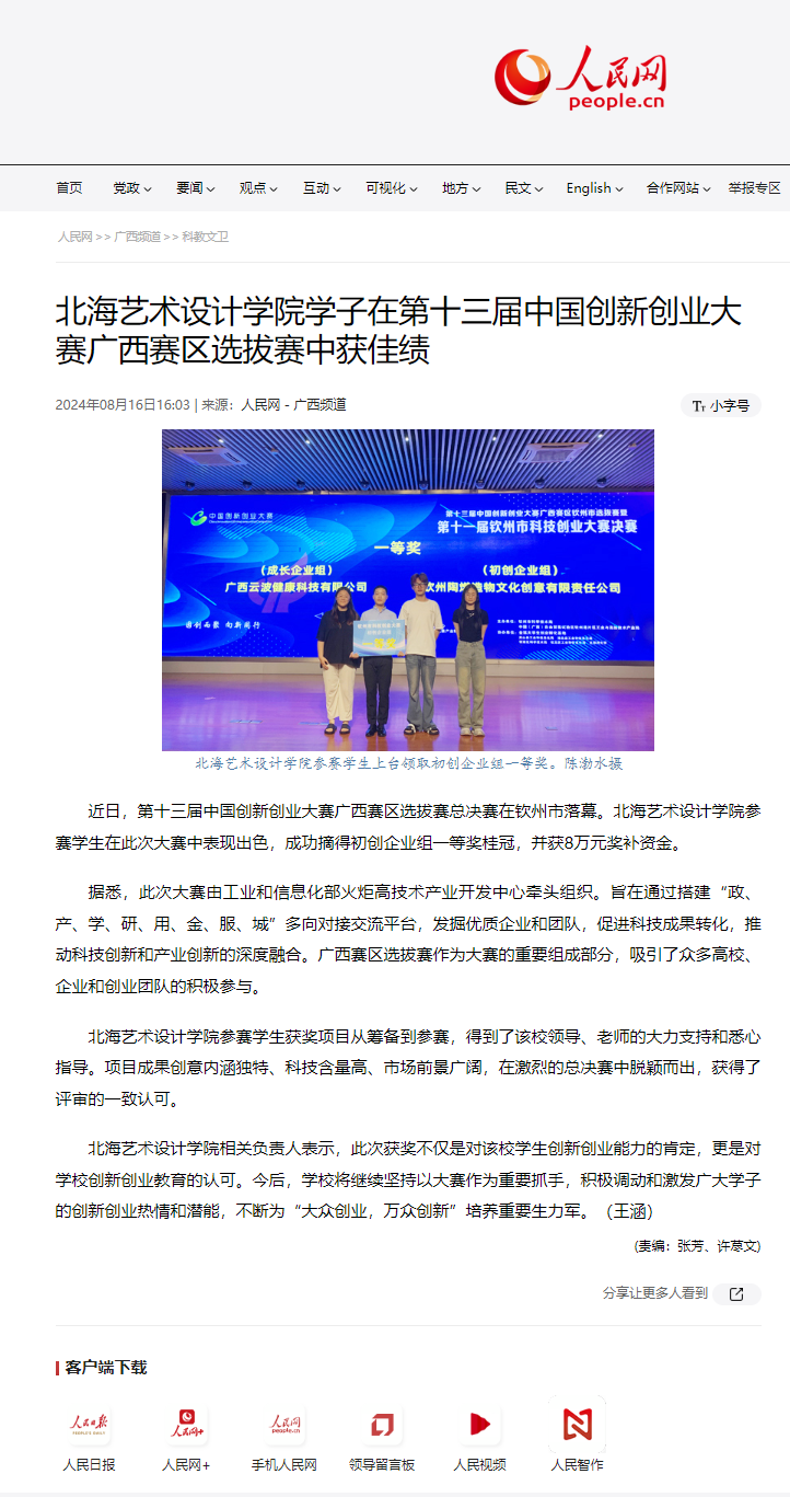 人民网:北海艺术设计学院在中国国际大学生创新大赛(2024)“数广集团杯”广西赛区选拔赛获佳绩