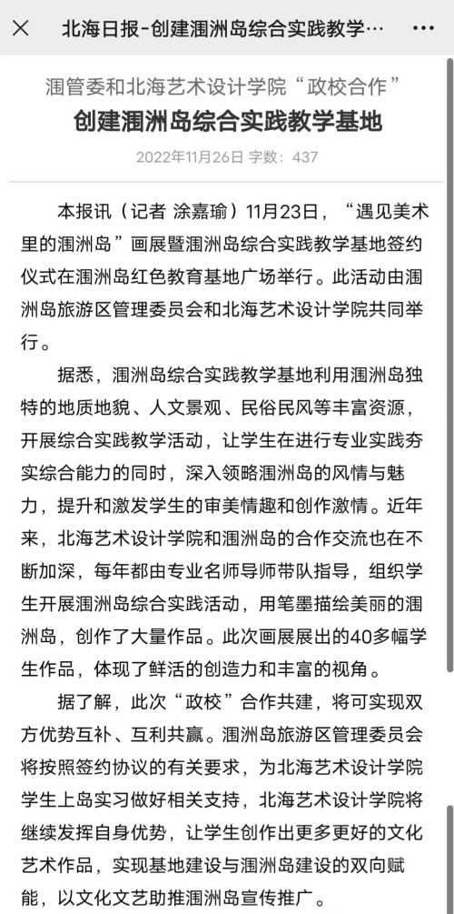 北海日报:涠管委和北海艺术设计学院“政校合作” 创建涠洲岛综合实践教学基地