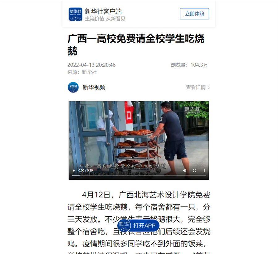 新华社:广西一高校免费请全校学生吃烧鹅