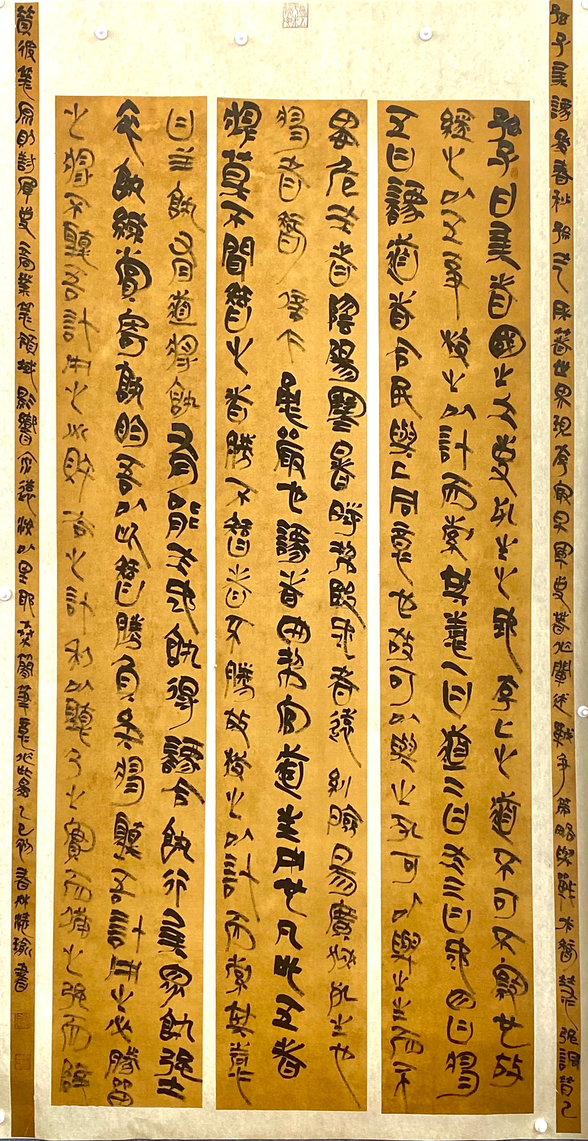 书法学院构建了现代化的学科培养体系,将“以文养书,以书育人”作为教学特色,为学生成长搭建了坚实平台。尤其“书法临创转换课程”,林清瑜受益匪浅,如篆书、隶书临创转换课程,通过量化分析书风源流,引导学生在传统与创新间找到平衡。她以《李阳冰三坟记》笔意融合现代装饰性结构,以行草书章法重构《里耶秦简》,逐步明确个人创作方向,展现了学院课程在激发创新思维上的成效。