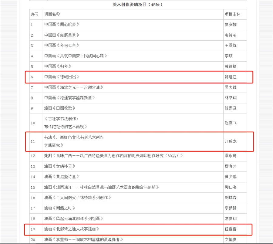 近日,根据广西艺术基金日常管理机构发布的《广西艺术基金2025年度一般资助项目名单通知》,我校美术学院的教师陈建江、程宣睿,书法学院教师江威龙,成功获得3项广西艺术基金2025年度一般资助项目(美术创作资助项目)资助。