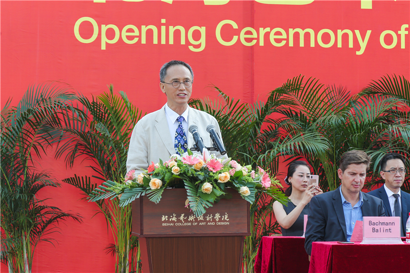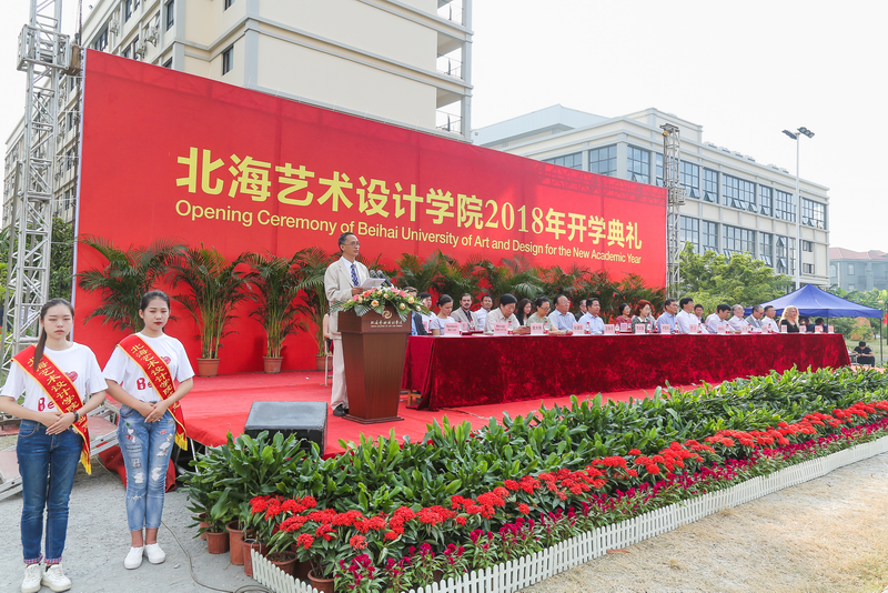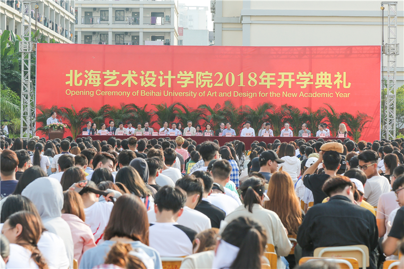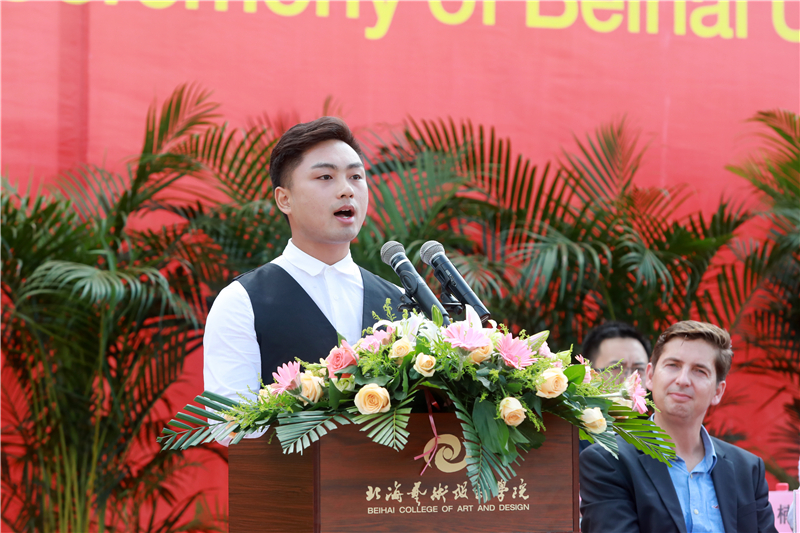 北海市委常委、宣传部部长、副市长黄江在典礼上致辞说,北海中国最美的海滨城市之一,是中国西南地区同时拥有深水海港、全天候机场、高铁、高速公路的城市,北海是古代“海上丝绸之路”的重要始发港,国家历史文化名城。北海市面临的北部湾有丰富的海洋资源,海洋生态环境良好,这里有热情好客的北海人民、有回味无穷的海鲜特产、有独具特色的地方文化。她指出,北海艺术设计学院是一个容纳上万人的校园,到处洋溢着朝气蓬勃,青春活力,希望同学们在新的学习环境中,要时刻牢记时代赋予大家的崇高使命,不断提升自身能力,努力练就扎实本领,脚踏实地、勤奋拼搏,走好大学之路,人生之路,将来成为对国家、社会有贡献的人才。