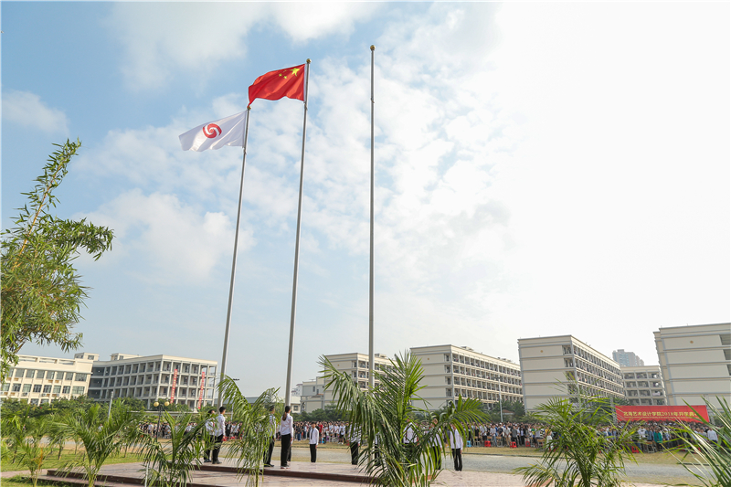 伴随着雄壮的国歌声,五星红旗冉冉升起,似初升的太阳傲然于蓝天;在激昂的校歌声中缓缓升起校旗,迎风而飘,寓意着北艺学子将努力航行,成为明日之星;在全体同学、老师和各领导庄严的注视中,拉开了北海艺术设计学院2018年开学典礼帷幕。