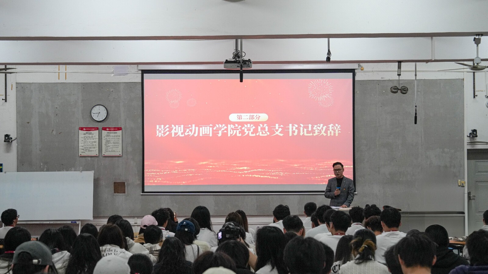 大会在庄严的国歌声中拉开序幕。学院党总支书记张帆老师为大会致辞,他充分肯定了分团委本学期在思想引领、组织建设和专业实践等方面取得的成效,并鼓励青年学子将专业创作与时代需求相结合,用动画语言传递青春正能量。