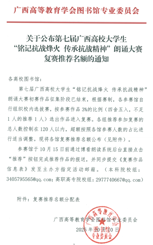 关于公布第七届广西高校大学生“铭记抗战烽火 传承抗战精神”朗诵大赛复赛推荐名额的通知