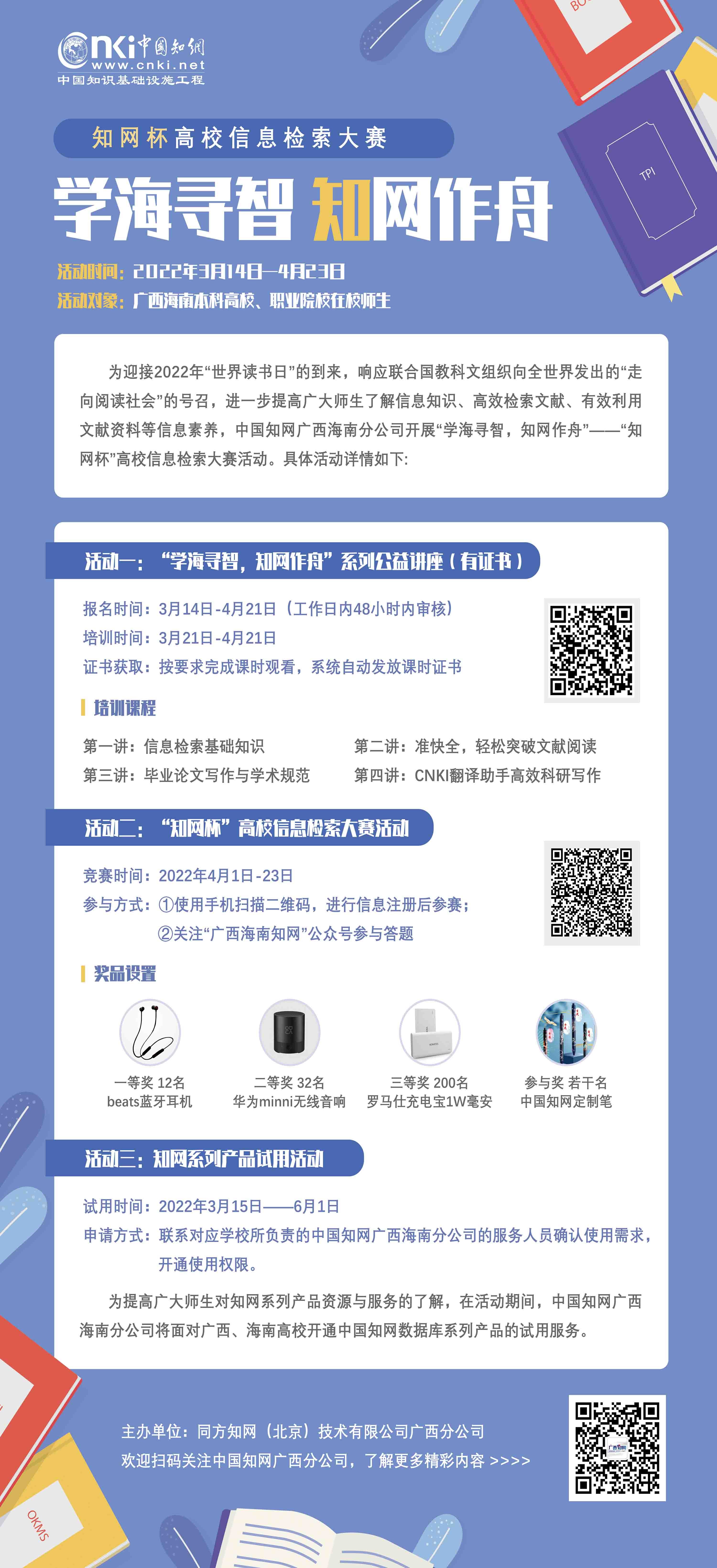 新的学期,新的开始,图书馆为了进一步提高我校师生信息知识储备,高效检索文献资源,充分利用文献资料,特将中国知网举办的“学海寻智 知网作舟”――“知网杯”高校信息检索大赛活动在我校推广,望广大师生积极参与。活动方案如下(具体参与方式详见活动推文):