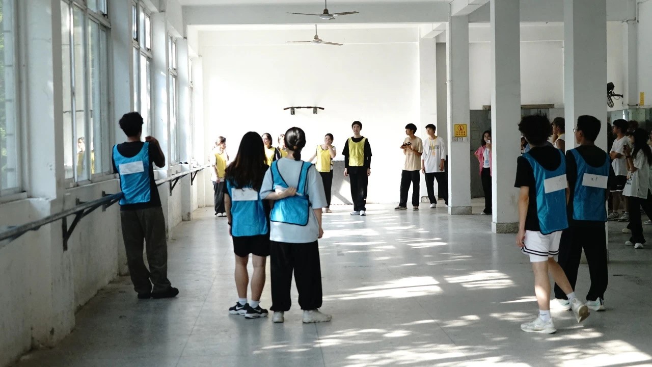 比赛开始前,同学们认真地听工作人员讲解游戏规则。