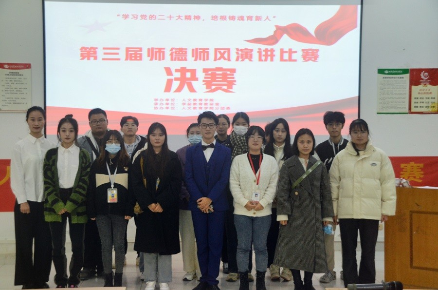 为进一步推动教学实践改革,展现我院学生风采,营造尊师重教氛围,培养和激发学生理想信念,加强专业角色认知,2022年12月2日,人文教育学院“学习党的二十大精神培根铸魂育新人”第三届师德师风演讲比赛决赛于东校区多媒体2教室顺利举行。