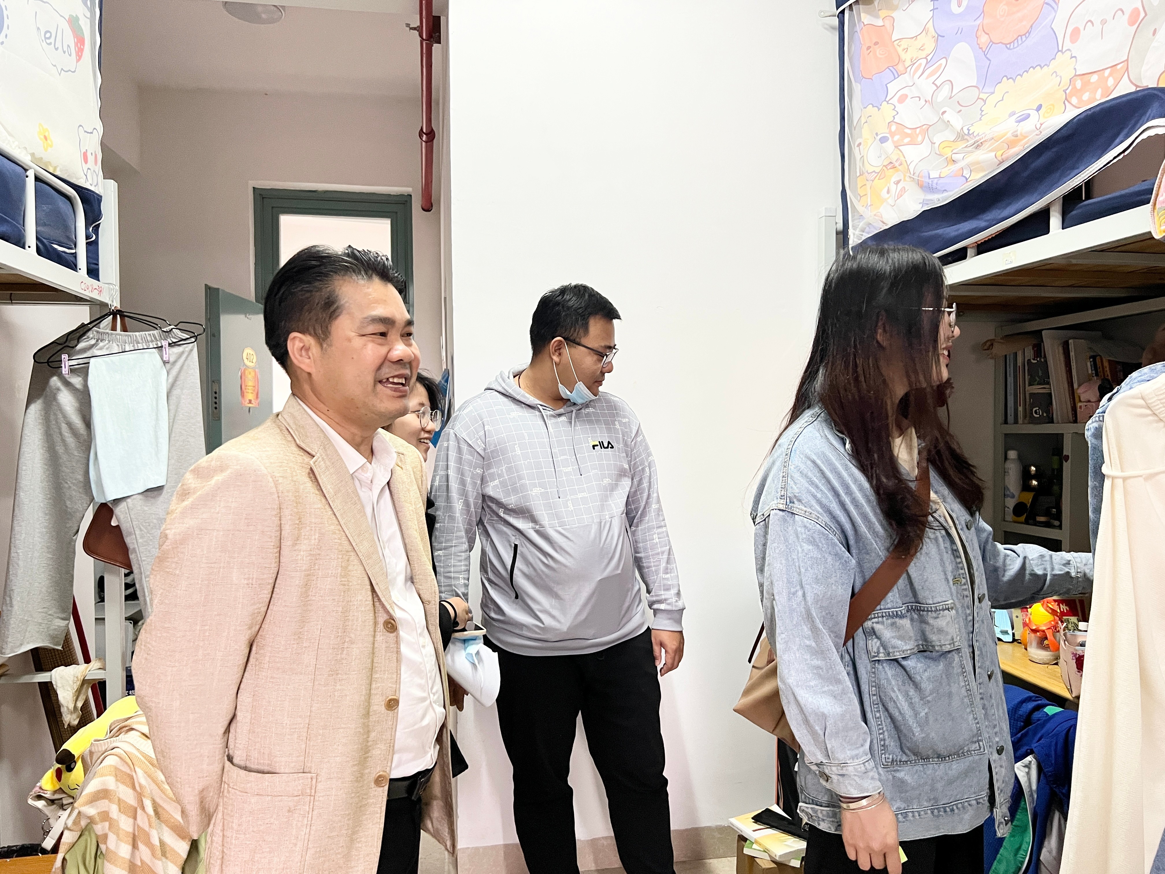 在整个走访过程中,领导们殷殷关切着每间宿舍的住宿环境,检查了寝室的各类电器,排除安全隐患。叮嘱同学们保持寝室卫生,保持宿舍通风透气,注意寝室用电安全。对同学们未来的学习生活方面提了诸多建议。