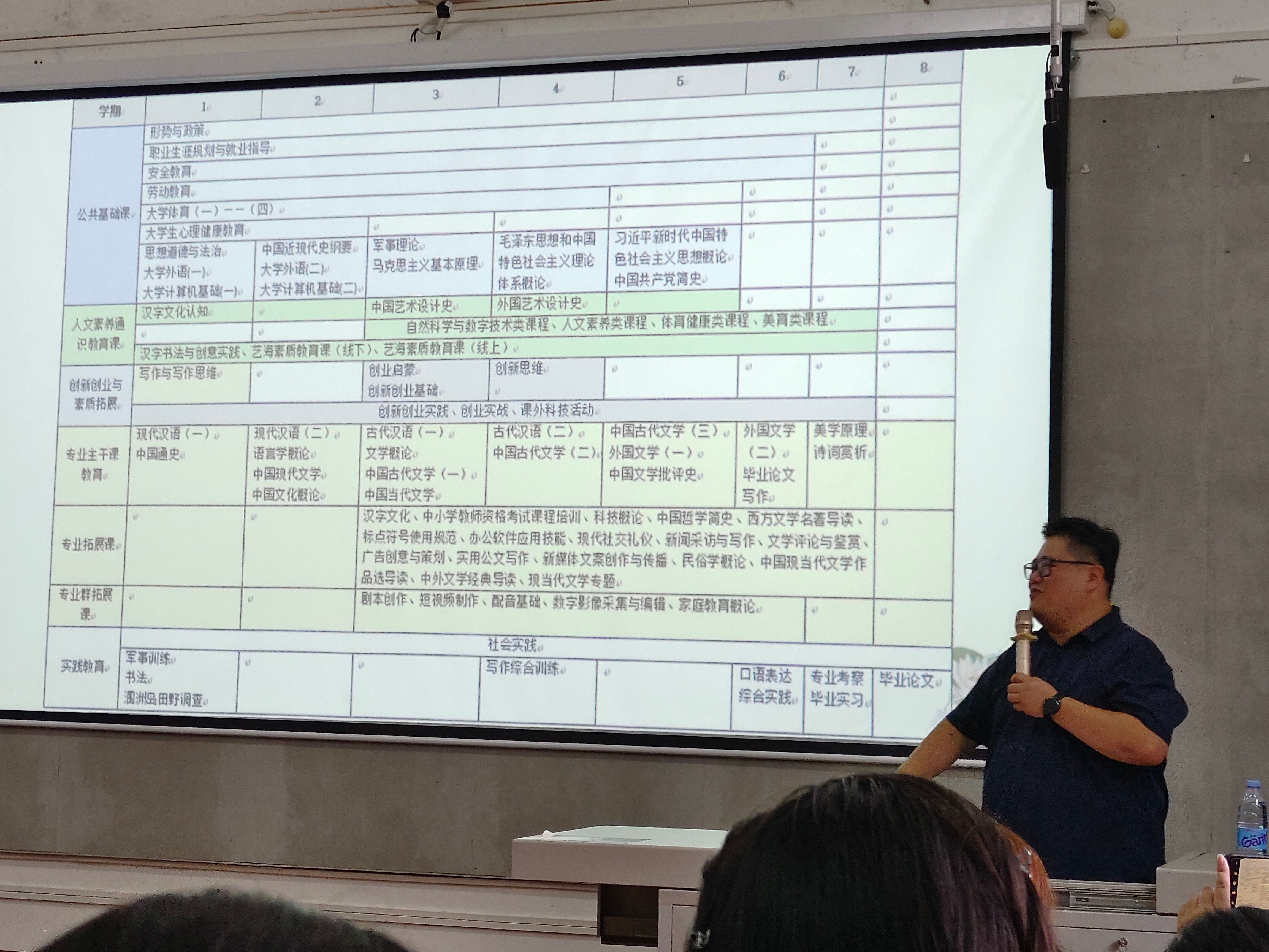 汉语言文学专业新生专业介绍会上,教研室副主任姜玮介绍了人文教育学院的发展历程与教师队伍,详细解读了本专业的发展特色、培养目标、核心课程、社会实践活动与就业前景,从专业所涉的各个方面为新生答疑解惑,使学生明白汉语言文学专业的课程体系和培养目标,以便学生对大学生涯进行合理规划。姜主任结合自己十多年的教学经历和对当下就业前景的认知,殷切希望汉语言文学专业的同学们能够明德修身、自强不息,尊师重教、弘扬正气,珍惜时光、不负韶华,志存高远、博学进取。