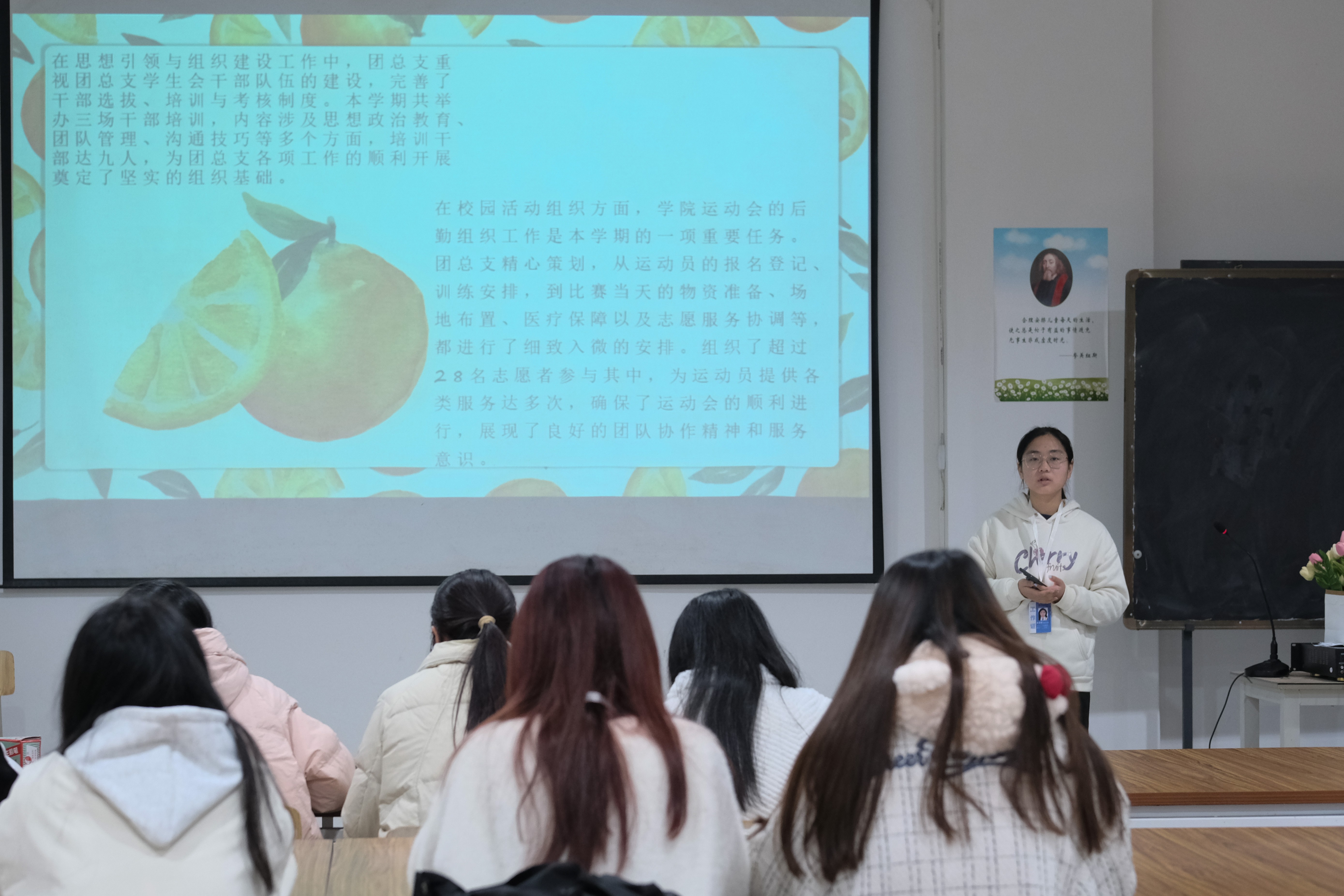 会议伊始,由各部门部长对本部门工作进行汇报,主要汇报各自部门的工作亮点、成果、遇到的困难与解决方案以及下学期的工作计划。随后由团总支主席张佳巾进行工作总结。