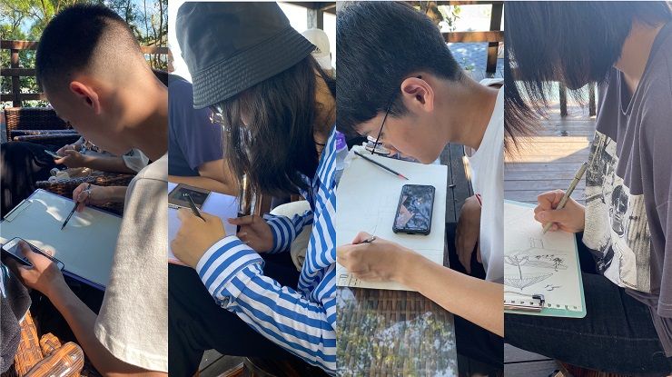 同一时间段,我院艺术教育专业的同学在唐道明老师的带领和指导下于鳄鱼山景区开启了他们的“写生之旅”。久居学院教室的同学们初次“解放双眼”,他们与自然天地为伴、与海洋风光为伍,用心感受大自然的风情、聆听大海的声音。风趣幽默的唐老师,用自己独特的方式向大家传递他对于美术的见解,在同学们作画之时给予细心点评,让同学们对构图、线条等方面有了更深刻的理解。“纸上得来终觉浅,绝知此事要躬行”,艺术教育专业的同学们在实践中与自然对话,将自然物语书于纸墨。岩石间忙碌的身影与海浪,阳光相融,构成了最美丽的人文风景画。