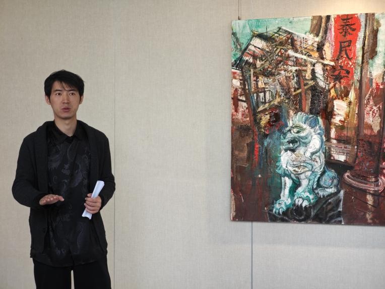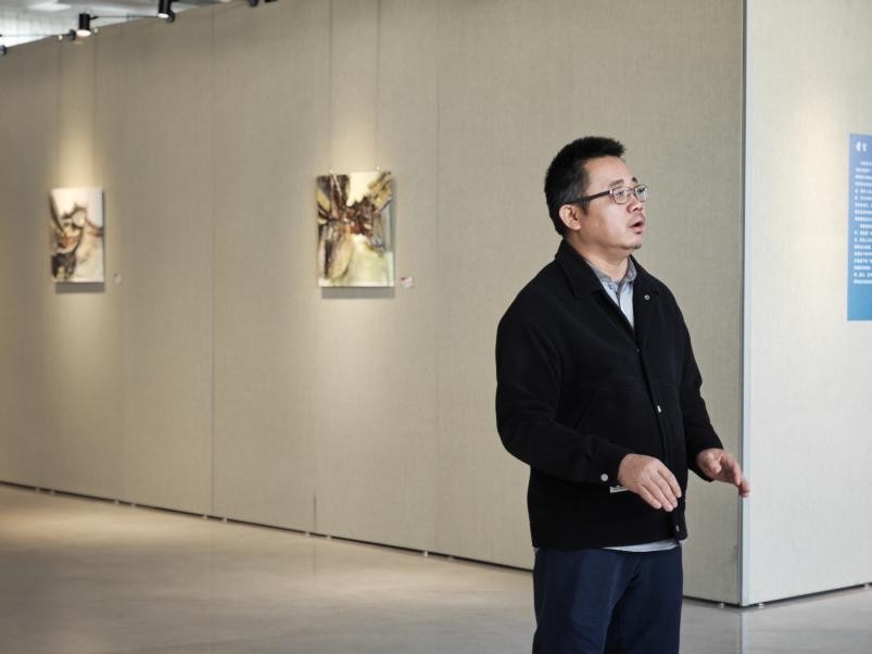 展览的主创者王云龙老师最后发言,分享了创作这组作品的初衷和背后的哲学思考。在现当代艺术的脉络中,现象学与表现主义的交汇为我们提供了一种新的方式来解读文化和空间的意义。海德格尔的现象学理论强调存在的显现,并试图揭示世界的本真面貌,而表现主义则通过夸张与扭曲的手法,揭示人类内心的深层情感和存在的困境。侗族建筑,作为中国传统文化的重要组成部分,它不仅承载着历史的记忆,更是一种具有深厚文化根基的空间语言。通过这两种视角的交融,我们得以重新审视和解读当代侗族建筑的文化符号及其内在的精神结构。侗族建筑独特的构造形式与美学,正如海德格尔所言,建筑是一种居住的表现,它不仅是物理空间的界定,更是人与周围环境、人与他者之间关系的体现。而表现主义绘画,则通过视觉语言的张力和情感的爆发,呈现出个体与环境之间的张力与冲突。本次展览作品,正是基于这一现象学与表现主义的结合,通过对当代侗族建筑的描绘,表达对其精神和艺术形式的敬意与思考。最后,艺术语言能够重新连接这些当代建筑形式,同时也为未来的文化传承和复兴提供一种新的可能性。