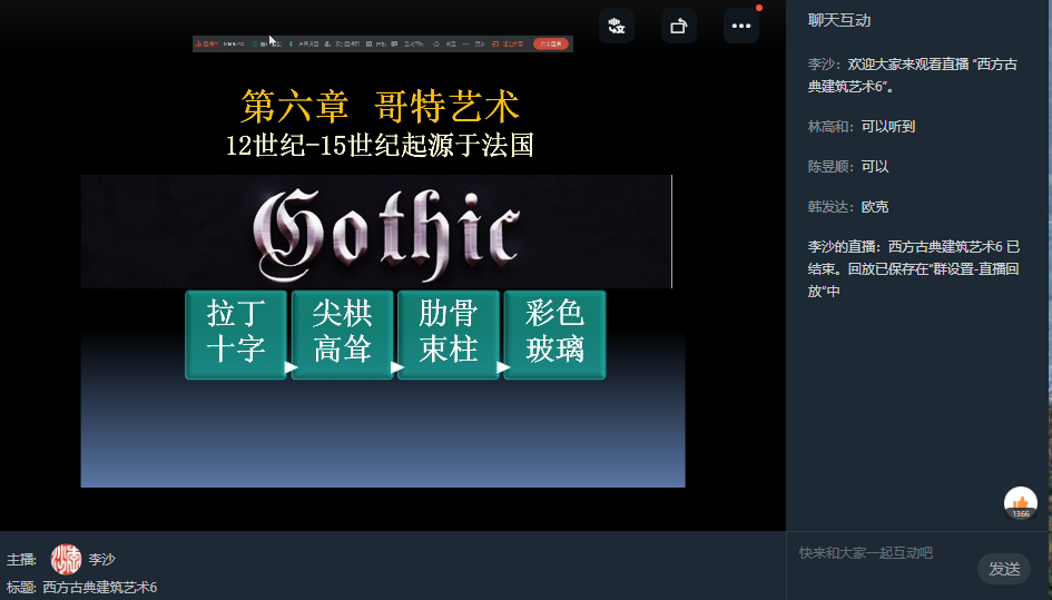 受疫情防控的影响,李莎教授采用线上直播形式为学生讲解西方古代建筑史内容,讲座主题涉及西方古典建筑发展的6个历史时期,包含古埃及、古希腊、古罗马、拜占庭、罗曼、哥特时期的建筑。讲座内容以时间发展序列和建筑风格的演变为主线,结合每个不同建筑历史时期的政治、经济等社会综合发展状况,阐述了不同建筑时期建筑风格产生的必然性及其建筑风格,使学生深刻理解建筑风格和特征的时代源头,做到知其然,也知其所以然。