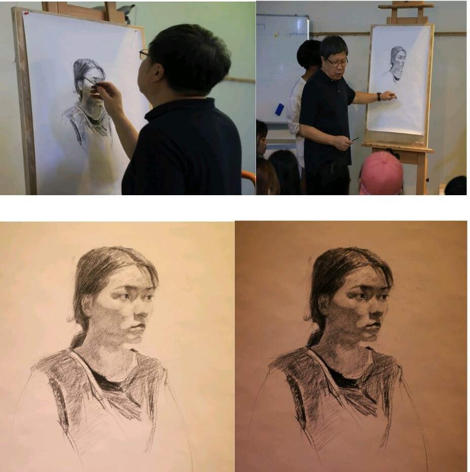 随后,计宇教授开始范画演示,他先把感觉上的大轮廓画出来,而后找具体的关系。并表示绘画的过程是一个修复的过程,要逐步地把它完善。作画中他给同学们细心讲解作画步骤及要领,从结构方面着手深入刻画,逐步使画面更加完整。在模特休息的课间,他与同学们亲切交谈,并倡导要把实践与理论结合起来。