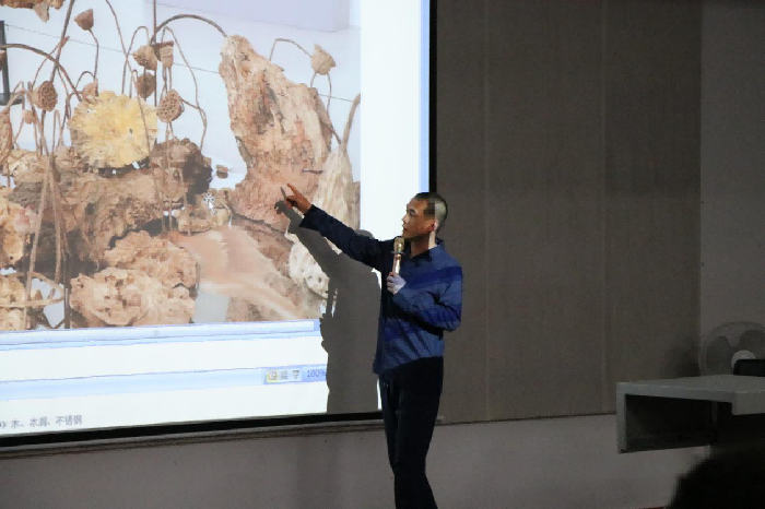 讲座开始前,王卓老师简单介绍了开学以来分别与三个年级雕塑专业同学的交流相处的感受,并且介绍了本次讲座的目的,他表示地域造就的偏差让很多同学对毕业创作感到很迷茫,以至于对课堂学了什么东西,自身达到了什么水平,掌握的技术和自我认知并不是很清楚。以此为目的,此次讲座内容主要分为三个方面:第一是“目的”,这也是最重要的一点,决定了同学们今后的行为;第二是“创作方法”;第三点是“展示”。