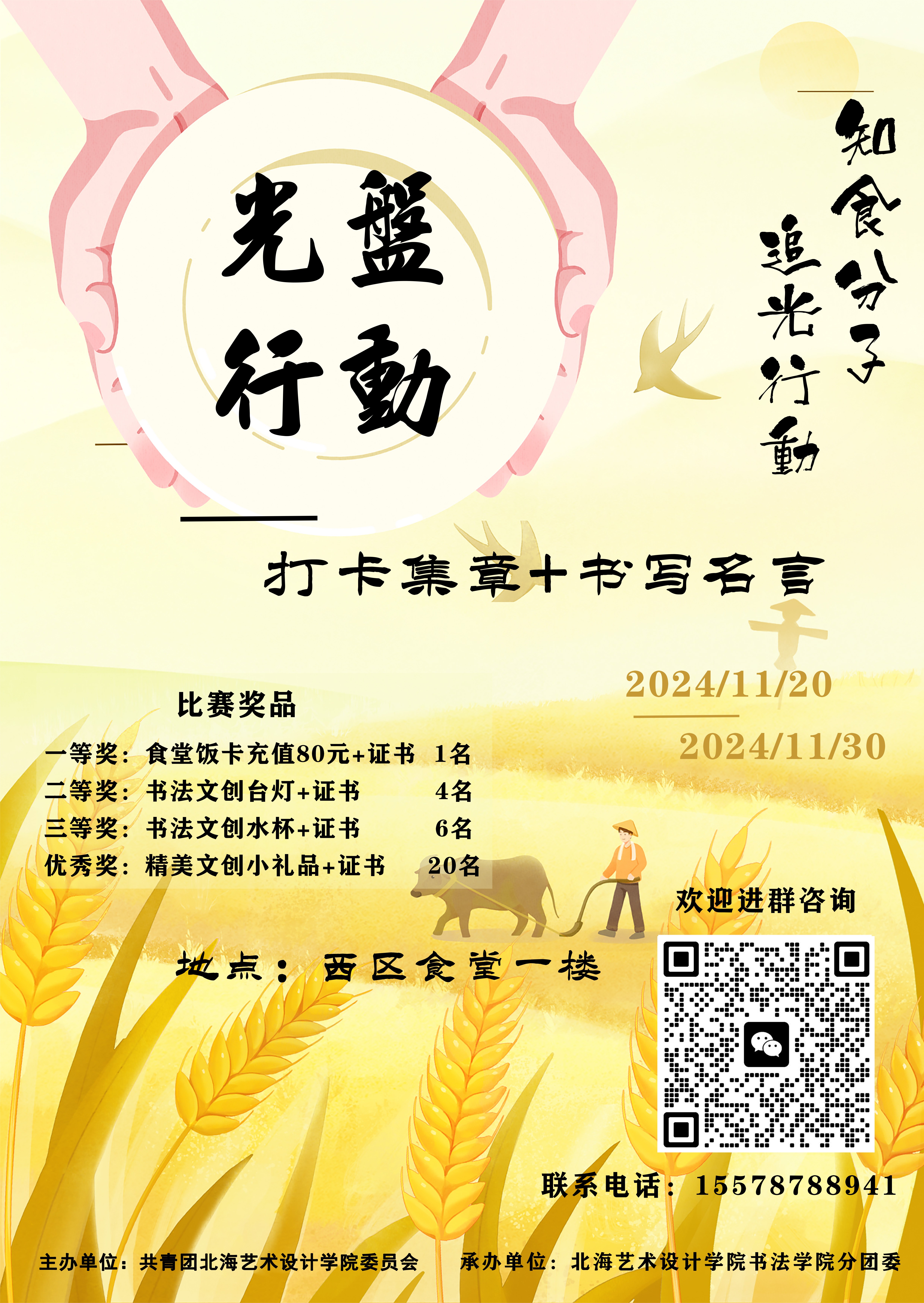 作品要求:现场书写活动。书写内容要求是一些有关珍惜粮食的名言诗句或者光盘后的心得感悟。所临摹创作书写的作品,加上书法集章打卡活动,按比重得分,(书法集章打卡比重占80%,现场书写比重占20%)最终由评审老师评选出等级奖并颁发奖品和证书。