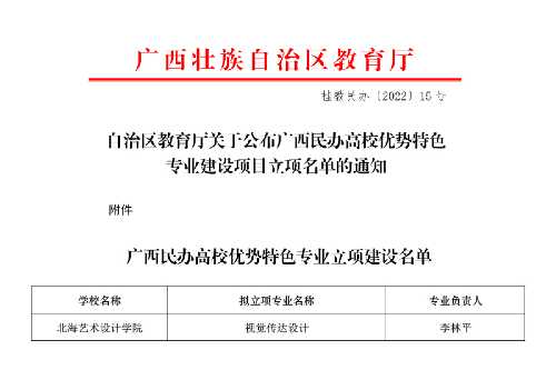近日,广西壮族自治区教育厅下发《自治区教育厅关于公布广西民办高校优势特色专业建设项目立项名单的通知》(桂教民办〔2022〕15号),公布了2022年度广西民办高校优势特色专业立项建设名单。我视觉传达设计专业入选。