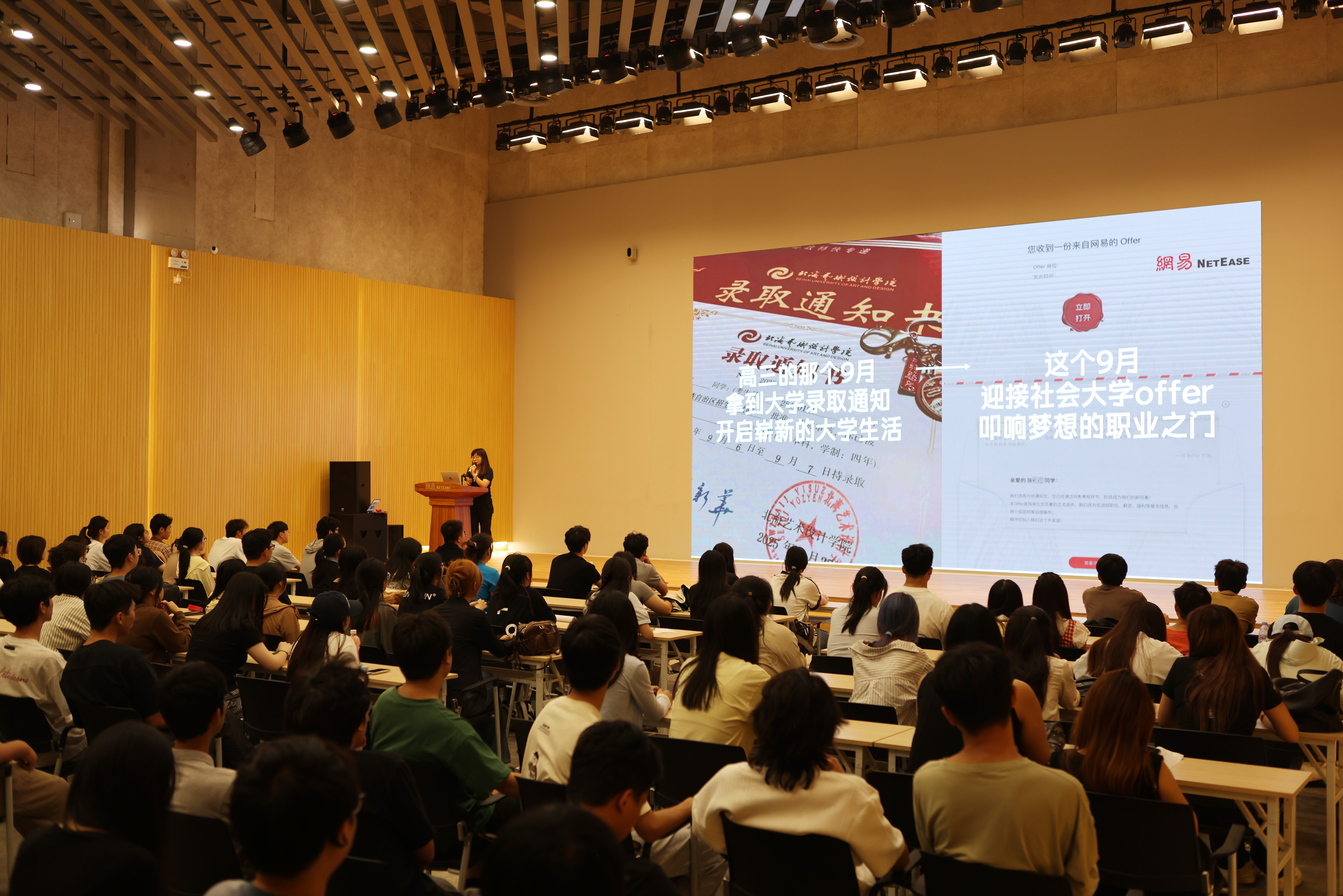 在对网易严选、有道精品课、有道词典、网易云课堂、有道云笔记等产品线进行深入介绍时,她特别强调了各业务板块对设计艺术人才的特定要求:"我们需要的不仅是掌握软件技能的设计师,更是能够理解用户需求、具备产品思维和创新能力的复合型人才。"针对招聘岗位,她详细说明了UI/UX设计师、视觉设计师、内容策划等岗位的专业能力要求,为同学们指明了能力提升的方向。