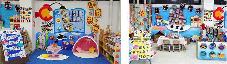 幼儿园教育环境创设课程是本科学前教育专业课程体系中的专业技能课,是美术综合知识技能结合幼儿园实践工作的具体实操课程,专业指向性强。课程对学生深刻认识环境对幼儿发展具有重要意义,有助于学生初步掌握独立创设幼儿园教育环境的能力,树立正确的学前教育观念。此次结课汇报展共展出作品十一组,作品以幼儿园环境创设基本理论为基础,联系教育见习经验,巧妙结合了北海地方文化特色。