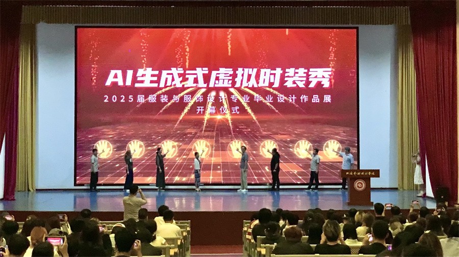 虚拟时装秀由服装学院师生组成的AI时尚团队以AI生成模型为创作引擎,通过对手绘效果图和成衣图像数据训练,精准理解并还原服装的色彩氛围、面料质地和廓形结构,生成虚拟动态视频,再经过后期渲染与剪辑,实现从草图到成衣再到虚拟时尚形象的智能创作,完成现实与虚拟效果交互,呈现了AIGC融入教学改革、跨专业交流等方面的最新成果。